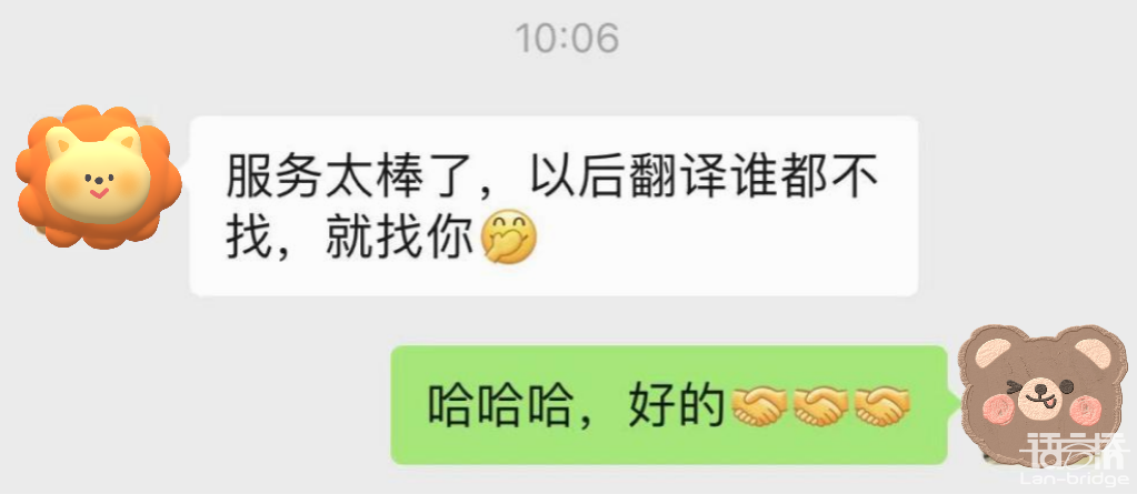 “為客戶創(chuàng)造價(jià)值”,這不是一句空洞的口號(hào),而是語(yǔ)言橋始終踐行的使命。“客戶第一、質(zhì)量?jī)?yōu)先、執(zhí)行到位”是每一個(gè)語(yǔ)言橋人刻在腦海里的工作準(zhǔn)則。