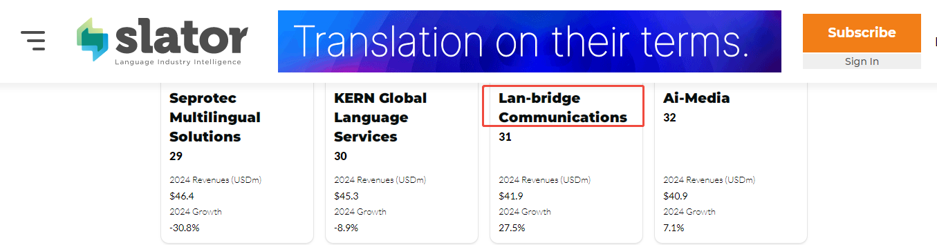 根據四川日報報道,語言橋已成功入選國家語言服務出口基地。根據CSA國際權威排行,語言橋已連續多年入選 CSA Global Top 50 語言服務供應商。2025年,在國際權威第三方機構——Slator發布的"The Slator 2025 Language Service Provider Index"(2025年語言服務提供商指數)中語言橋位列全球翻譯服務提供商第31位。與此同時,語言橋已榮獲ISO9001:2015質量管理體系認證、國家高新技術企業、翻譯協會會員、AAAAA級筆譯服務認證、AAAAA級口譯服務認證、亞太地區語言服務提供商TOP10、全國優秀翻譯服務企業等多項殊榮。